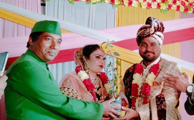 मसूरी, । शादी का बंधन जीवन के सफर में खुशियां लाती हैं यह एक ऐसा पल होता हैं जो जीवनभर एक दूसरे के सुख दुःख में साथ निभाने की रस्में होती हैं। राइका मरोडा, सकलाना में कार्यरत पर्यावरणविद्  वृक्षमित्र डॉ त्रिलोक चंद्र सोनी दूल्हा लोकेश व दुल्हन सोनम के शादी में कैम्पटी पहुंचकर वर वधू को शगुन में तुलसी का पौधा उपहार में देकर आशीर्वाद दिया।  वृक्षमित्र डॉ त्रिलोक चंद्र सोनी कहते हैं वर वधू को शगुन में पौधा देने से उनके जीवन में खुशियां आती हैं जिस प्रकार पेड़ अपार खुशियां दूसरों को देकर खुश रहता हैं उसी प्रकार अपनो के साथ खुश मिलकर जीने की प्रेरणा देते है पेड़ पौधे, उसी प्रकार शगुन में दिया पौधे के रोपण से जीवन में खुशियां आती हैं हर अभिभाव को अपने बच्चों के शादी में शगुन में पौधा देकर इस धरती को उपहार स्वरूप एक पौधा अवश्य रोपे। दूल्हा लोकेश कहते हैं शगुन में दिया पौधा प्रकृति देवता का आशिर्वाद हैं वही दुल्हन सोनम कहती हैं प्रकृति की तरह औरत को माना जाता है मेरा प्रयास भी इस धरा में निहित संसाधनों को बचाने का प्रयास किया जायेगा। कार्यक्रम में नरेंद्र रावत, वीरेंद्र सिंह रावत, शिवेंद्र रावत, कमलेश, सिब्बल सिंह सजवाण, सावित्री देवी अनसूया सिंह पवार, लक्ष्मी प्रसाद भट्ट आदि थे।