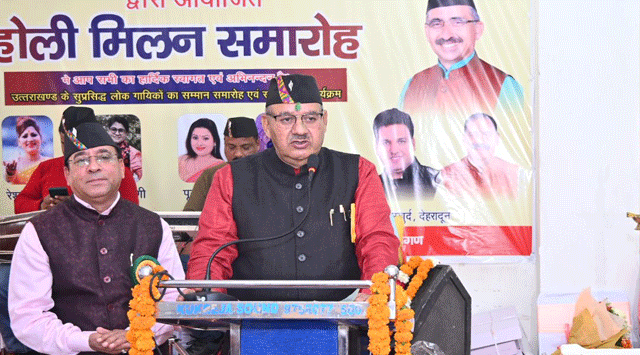 देहरादून, । कैबिनेट मंत्री गणेश जोशी रविवार को अपनी धर्म पत्नी संग कालिदास मार्ग स्थित सामुदायिक भवन में कुर्मांचल सांस्कृतिक एवं कल्याण परिषद शाखा हाथीबड़कला देहरादून द्वारा आयोजित होली मिलन समारोह कार्यक्रम में बतौर मुख्य अतिथि प्रतिभाग किया। कार्यक्रम का आगाज दीप प्रज्ज्वलित कर किया गया। इस अवसर पर मंत्री गणेश जोशी ने सभी को होली की अग्रिम बधाई एवं शुभकामनाएं दी। होली मिलन समारोह में कई सांस्कृतिक प्रस्तुति भी दी गई। इस अवसर पर मंत्री गणेश जोशी ने कहा होली का पर्व हमें अधर्म असत्य व अन्याय जैसी नकारात्मक प्रवृत्तियों से लड़ने की प्रेरणा देता है।उन्होंने कहा कि होली का त्यौहार, देश की सांस्कृतिक एकता को मजबूती प्रदान करने में तथा भाई-चारे एवं समरसता की भावना को बढ़ाने में महत्वपूर्ण भूमिका निभाता है। मंत्री ने कहा कि होलिका दहन जैसे प्रतीकों के माध्यम से सामाजिक एवं व्यक्तिगत बुराईयों को नष्ट करने तथा होली के मोहक रंगों को जीवन में उतारने का प्रयास किया जाना चाहिए। मंत्री गणेश जोशी ने होली का पर्व हर्षोउल्लास के साथ मनाए लेकिन हमें इस होली पर सभी को संकल्प लेना होगा होली के दिन अपने अंदर की सभी बुराइयों को समाप्त करें। इस अवसर पर अध्यक्ष उत्तम सिंह अधिकारी सचिव विजय बिष्ट कोषाध्यक्ष मंगल सिंह बिष्ट सांस्कृतिक सचिव भावना बिष्ट सह सचिव चंद्रशेखर रूवाली, नवीन जोशी, आर. एस परिहार, निर्मला जोशी, पुष्पा बिष्ट, बहादुर सिंह बिष्ट, मोहन बिष्ट, रेवा चैहान, जीत सिंह नेगी कैलाश पंत सहित कई लोग उपस्थित रहे।