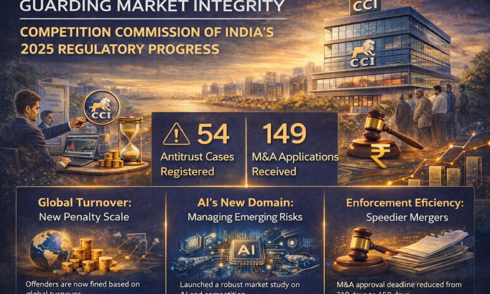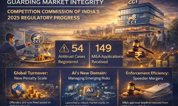 नई दिल्ली — बाजार की अखंडता बनाए रखने के उद्देश्य से नियामक निगरानी का सशक्त प्रदर्शन करते हुए, भारतीय प्रतिस्पर्धा आयोग (CCI) ने पूरे 2025 के दौरान प्रवर्तन और परामर्श गतिविधियों में उल्लेखनीय वृद्धि दर्ज की। कॉर्पोरेट कार्य मंत्रालय द्वारा जारी आंकड़ों के अनुसार, निष्पक्ष-व्यापार नियामक ने प्रतिस्पर्धा-विरोधी प्रथाओं से संबंधित 54 मामले दर्ज किए और 149 विलय एवं अधिग्रहण (M&A) आवेदन प्राप्त किए, जो कड़े पहरे के साथ-साथ गहन कॉर्पोरेट एकीकरण के दौर का संकेत देते हैं।