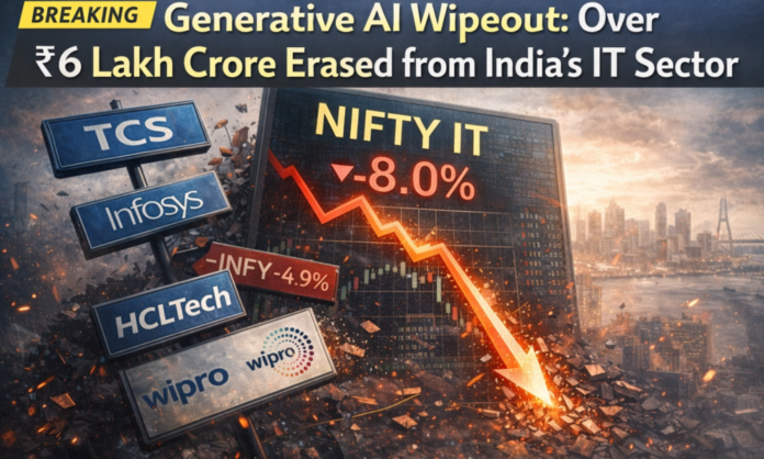मुंबई — भारतीय सूचना प्रौद्योगिकी (आईटी) क्षेत्र, जो कभी देश के शेयर बाजारों का निर्विवाद सरताज हुआ करता था, वर्तमान में एक बड़े संकट के दौर से गुजर रहा है। पिछले आठ कारोबारी सत्रों में, एक भीषण बिकवाली ने इसके बाजार पूंजीकरण (मार्केट कैप) से ₹6 लाख करोड़ से अधिक का सफाया कर दिया है। निफ्टी आईटी इंडेक्स में 8% से अधिक की गिरावट आई है, जिसके पीछे एक ही अस्तित्वगत डर है: कि ‘जेनरेटिव’ और ‘एजेंटिक एआई‘ पारंपरिक आउटसोर्सिंग मॉडल को पूरी तरह खत्म कर देंगे।